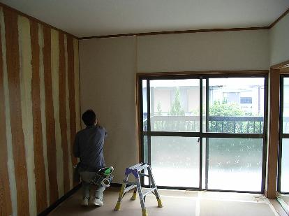 進んでいます。写真は2階洋間のクロス貼りを しているところです。左壁は、薄茶と白のまだら 状になっています。白い部分は合板の継ぎ目に パテをうって、継ぎ目が浮き出ないようにするため の下地処理です。そして合板部分にはシーラー処 理をしています。これはクロス接着の着きを良く するためとはがれを防ぐためです。 千年ホームの不動産 http://www1.ocn.ne.jp/~sennen/index.html 明日がある社長ブログhttp://blog.goo.ne.jp/sennen_2006/ スタッフブログ http://sennenhome.blog26.fc2.com/ 再生中古住宅の不動産のことなら売りたい方も、買いたい方もまずは お問い合わせ下さい。コストを最大限に活かしたリフォームで中古住宅 を再生させます。(周南市、下松市、光市、防府市の不動産エリア) | カレンダー