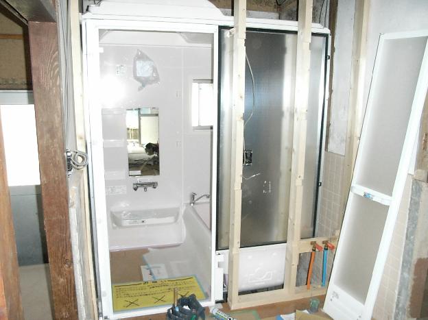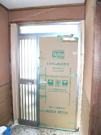 中古住宅の玄関入口巾は、1.4mしかありませんでした。 間口1.4mの建具は70㎝になり通りづらくなります。 そこで、片袖をつけた玄関ドアに取り替えました。ドアの 巾は90㎝あるので、通りづらいという問題は解消しました。 ランマ部分は、現場に合わせてカットしました。 玄関内部の壁と天井は、下地を造ったあと、クロス仕上げ をします。玄関土間はタイル仕上げをします。 トステム片袖飾りランマ付き ポスト付きL10玄関ドア 千年ホームの不動産 http://www1.ocn.ne.jp/~sennen/index.html 明日がある社長ブログhttp://blog.goo.ne.jp/sennen_2006/ スタッフブログ http://sennenhome.blog26.fc2.com/ 再生中古住宅の不動産のことなら売りたい方も、買いたい方もまずは お問い合わせ下さい。コストを最大限に活かしたリフォームで中古住宅 を再生させます。(周南市、下松市、光市の不動産エリア) 昨日はユニットバスの組立工事をおこないました。