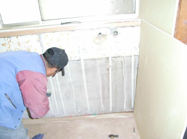 定まっています。築後33年の建物だと当時は、そのような規定は ないので合板材で作られていました。下のキッチンリフォームは、 古い壁材と天井材を撤去して、新たな不燃材壁を取り付けてい るところです。みえない部分ですが大切な工事です。 しました。古いタイルもはぎ取り 平垂木などで壁を調整します。 使えないので、両面テープと特殊ボンド を使って壁材を張り付ける 準備をします。 不燃ボードを取り付けた後は、 特殊ボンドが固まるまで仮止 めをします。 通常は引き違い玄関の巾は、1.8mですが、今回の