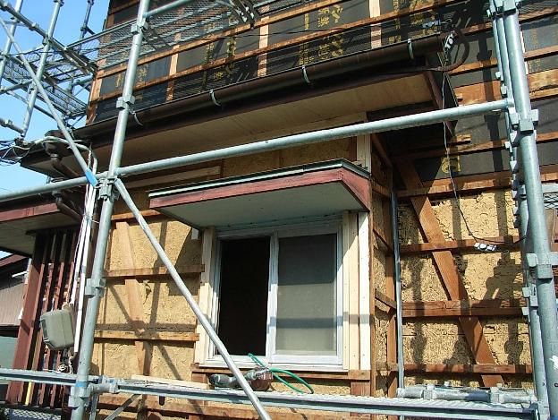 この時、軒天などが腐っていた場合は、新たに軒天を やり替えます。下地の調整が済むと、次は防水シートを 張り付けていきます。この防水シートは、透湿防水性に なっていて、室内の湿気は室外に出しますが、室外の雨 などは室内に通さないようになっています。 窓回りなど胴ブチで下地を調整する 透湿防水シートを張る 千年ホームの不動産 http://www1.ocn.ne.jp/~sennen/index.html 明日がある社長ブログhttp://blog.goo.ne.jp/sennen_2006/ スタッフブログ http://sennenhome.blog26.fc2.com/ 再生中古住宅の不動産のことなら売りたい方も、買いたい方もまずは お問い合わせ下さい。コストを最大限に活かしたリフォームで中古住宅 を再生させます。(周南市、下松市、光市の不動産エリア) PR 下水排水工事をおこなっています。一番奥側の升がトイレ用で
