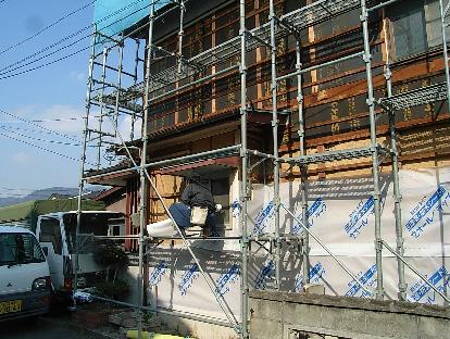 東面と南面は、隣の家と隣接しているので、足場には ネットを張っています。物が落下した場合、隣の敷地に 落ちないようにするためのものです。西と北は二面道路 に面しているのでネットは張っていませんが、西面の軒先 だけネットを張っています。これはセメント瓦を高圧洗浄を するのに、水の飛びちりを防ぐためです。 西面の鉄板壁剥がしが終わり、北面の 鉄板剥がしを始めました。 千年ホームの不動産 http://www1.ocn.ne.jp/~sennen/index.html 明日がある社長ブログhttp://blog.goo.ne.jp/sennen_2006/ スタッフブログ http://sennenhome.blog26.fc2.com/ 再生中古住宅の不動産のことなら売りたい方も、買いたい方もまずは お問い合わせ下さい。コストを最大限に活かしたリフォームで中古住宅 を再生させます。(周南市、下松市、光市の不動産エリア) キッチンの壁、天井は、防火上不燃材を使うように建築基準法で
